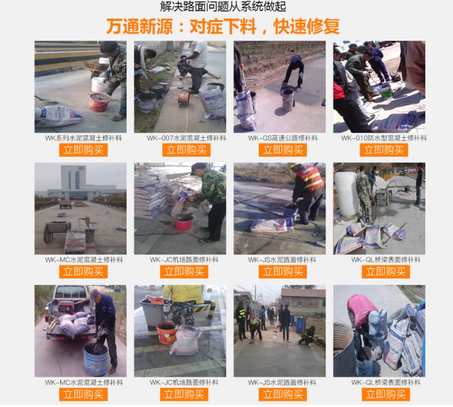 大慶萬通新源科技有限公司獨有的混凝土路面高強速補料,是水泥混凝土路面病害修復的好材料。疲勞、凍融循環、彎曲壓力、滲水和基層破壞等原因都會引起水泥路面的破損,從而帶來高昂的維護費用。與以往的剛性修補方法不同,混凝土水泥路面維修速補膠提供了一種獨特的柔性修補產品和技術,高柔性、高抗拉性,可跨伸縮縫施工和高抗壓性使得混凝土快補產品為水泥混凝土路面提供了******性的修補。傳統的剛性修補方案,如環氧砂漿和快干水泥產品,由于其自身的粘結失效,抗疲勞性低以及與原路面不同的伸縮系數,修補面會在短時間內失效或產生新的裂縫,需要反復修補,有效期短且費用高昂。大慶萬通新源科技有限公司的混凝土水泥路面維修速補膠可以隨原路面一起伸縮,移動,從而避免了粘結失效和產生新裂縫。萬通快補產品優異的粘結性、柔韌性和高防滑性,特別適用于水泥路面的淺層粘合修補,多邊角混凝土板層修補,跨伸縮縫修補以及路面沉陷修補。萬通混凝土病害修補料針對混凝土起皮起沙、斷板裂縫、蜂窩麻面、坑槽露石子、漏筋掉皮、橋梁的掉皮漏筋快速通車使用時間長。應用萬通快補產品,施工后一天就可以恢復交通。大慶萬通新源科技有限公司的萬通水泥路面維修速補膠適用于高速公路、機場路面、農村村村通路面、廠坪、學校操場、市區公路、小區路面、橋梁、水泥路面的修補。使用萬通特快補材料修補路面可以一勞永逸! 水泥地面起砂怎么辦,混凝土修補劑混凝土地面起砂,混凝土地面修補,地面起砂怎么辦,